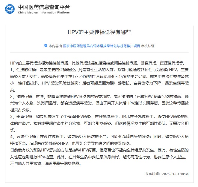 (?中國醫藥信息查詢(xún)平臺上關(guān)于HPV主要傳播途徑的介紹)